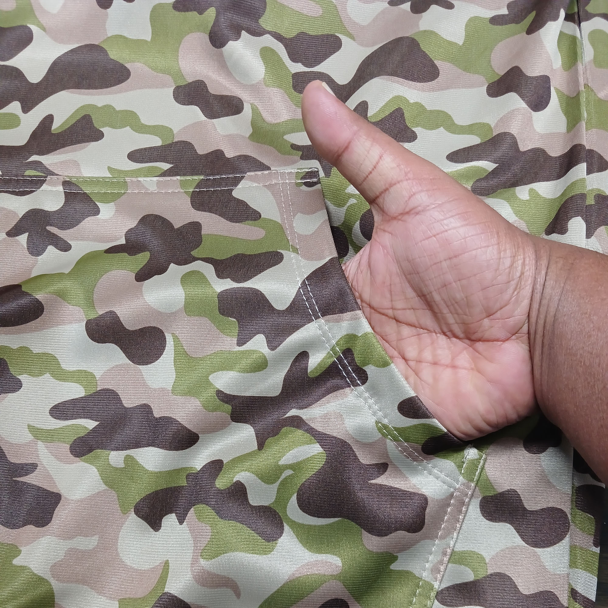 Fabric: 340gsm Heavyweight Poly-Cotton Ripstop. Tear-resistant, quiet in the brush, and maintains integrity through rugged use.